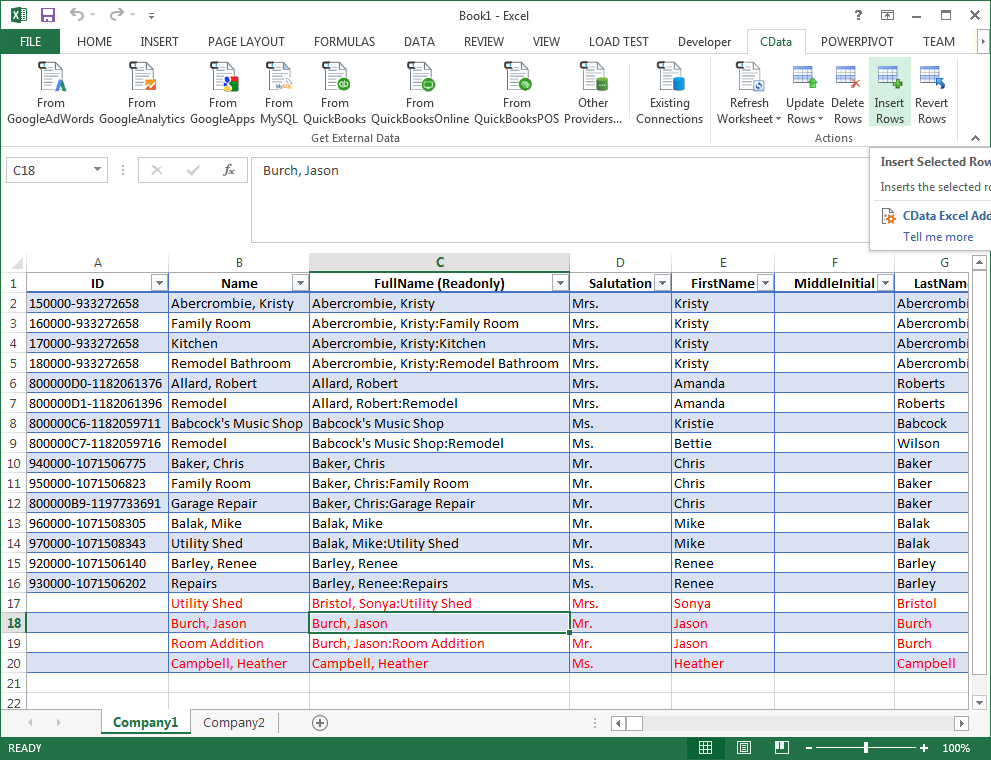 変更を会社ファイルに保存するには、変更されたセルを選択し、「Insert Rows」をクリックします。挿入が完了すると、新しい行は黒色に変わります。もう一方の会社ファイルのスプレッドシートで「Refresh Rows」をクリックすると、転送された行を確認できます。