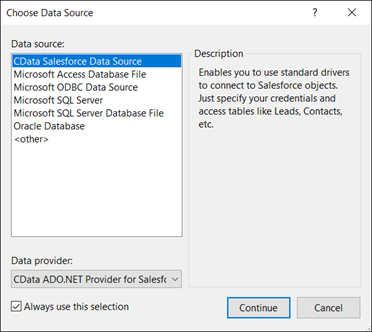 この記事では Salesforce ADO.NET Provider を例として使用していますが、ここで紹介する手順は CData がサポートする 250 以上のデータソースすべてに適用できます。