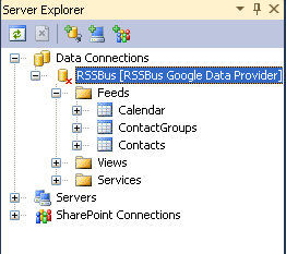 サーバーエクスプローラーで CData Google Data Provider を見ると、Feeds、Views、Services があることがわかります。 Feeds と Views は基本的にデータテーブルで、Feeds は読み書き可能、Views は読み取り専用です。