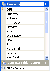 Contacts テーブル用の DataAdapter を作成するには、Contacts テーブルを DataSet デザイナーにドラッグ&ドロップするだけです。 Google データが使用するすべてのカラムを含むデフォルトの DataTable と、DataTable を埋めるための TableAdapter が作成されます。 DataAdapter の一部として SQL クエリを指定してレコードやカラムのサブセットを抽出することもできますが、デフォルトではすべてを抽出します。