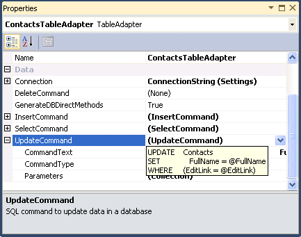 Update メソッドを作成するには、DataSet エディターを開き、ContactsTableAdapter のプロパティを確認します。 Update command をクリックし、New を選択します。次に、上記の SQL コマンドを入力すれば完了です。
