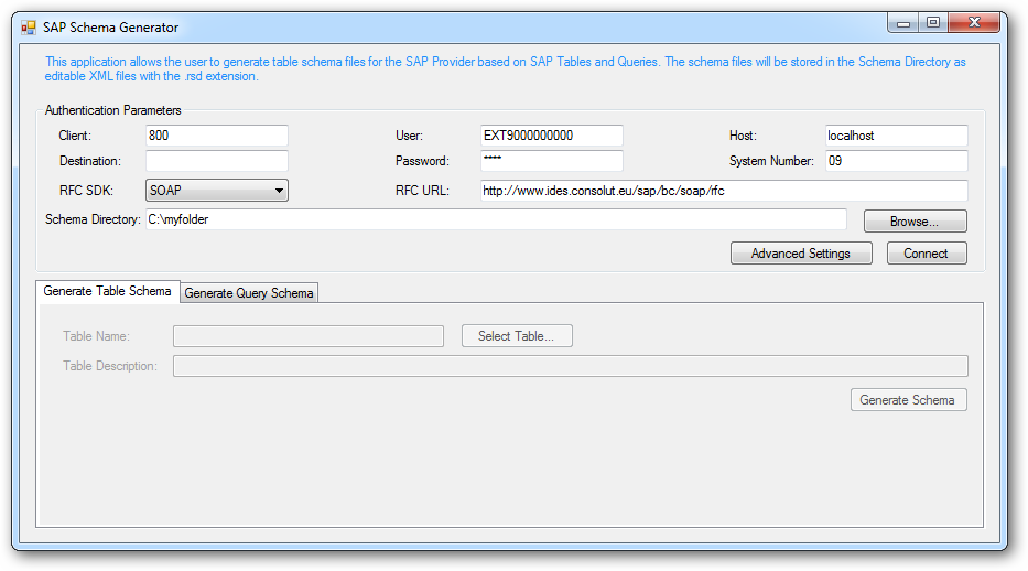 添付のアプリケーションを使用して、 SAP テーブルと SAP クエリの両方のスキーマファイルを生成できます。