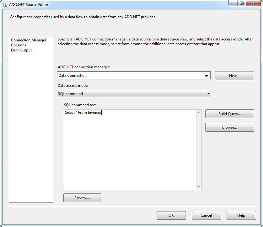 - ADO.NET Source エディターを開き、以下の情報を設定します: