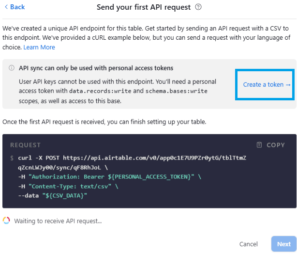 - リクエストを実行した後、同期設定 UI で「✓ API request received」というメッセージが表示されて Airtable が接続を確認するのを待ち、Next をクリックします。