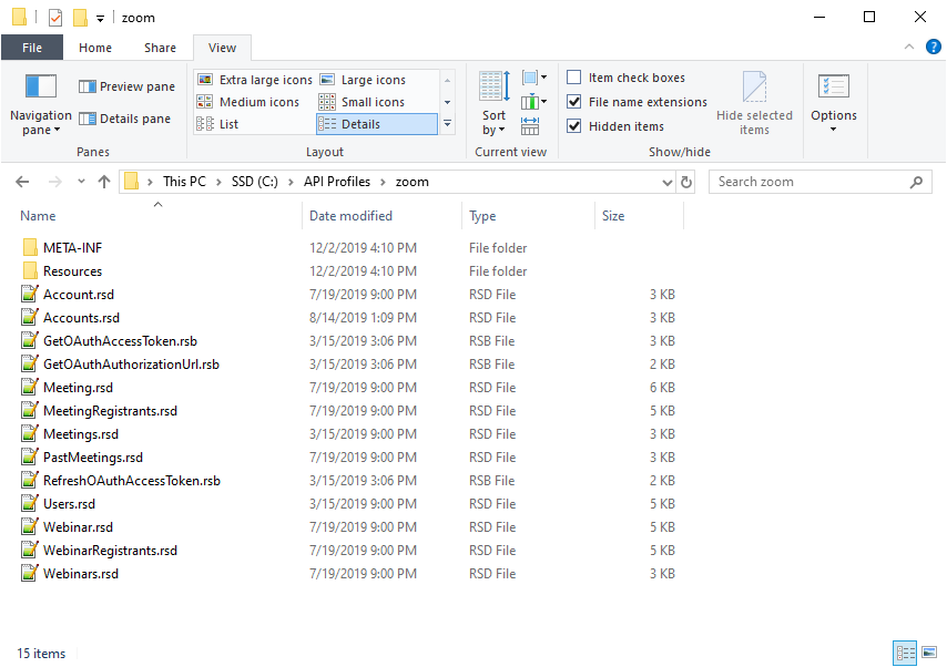 スキーマファイルへの編集が完了したら、Zoom アカウントへのミーティングの INSERT を開始する準備ができました。スキーマファイルを保存し、スキーマファイルを再圧縮(zip)して、圧縮ファイルの拡張子を .apip に変更します。標準接続をサポートするアプリケーションを使用して、API Driver を介して API プロファイルに接続し、INSERT ステートメントを実行してください。