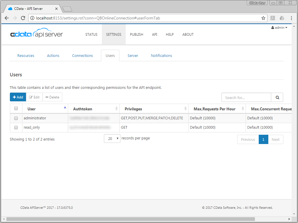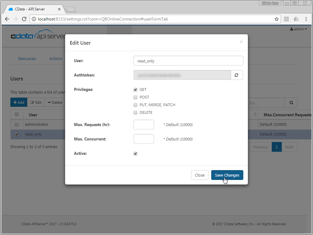 スクリーンショットで確認できるように、読み取りと書き込みのアクセス権を持つユーザーは既に設定されています。この記事では、関連付けられた authtoken を使用して、読み取り専用ユーザーで API Server にアクセスします。