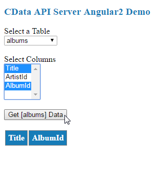 テーブルとカラムを選択したら、Get [table] Data ボタンをクリックして、API Server を介してデータベースからデータを取得できます。HTML テーブルには、ボタンをクリックする前に選択したテーブルとカラムに基づいてデータが表示されます。