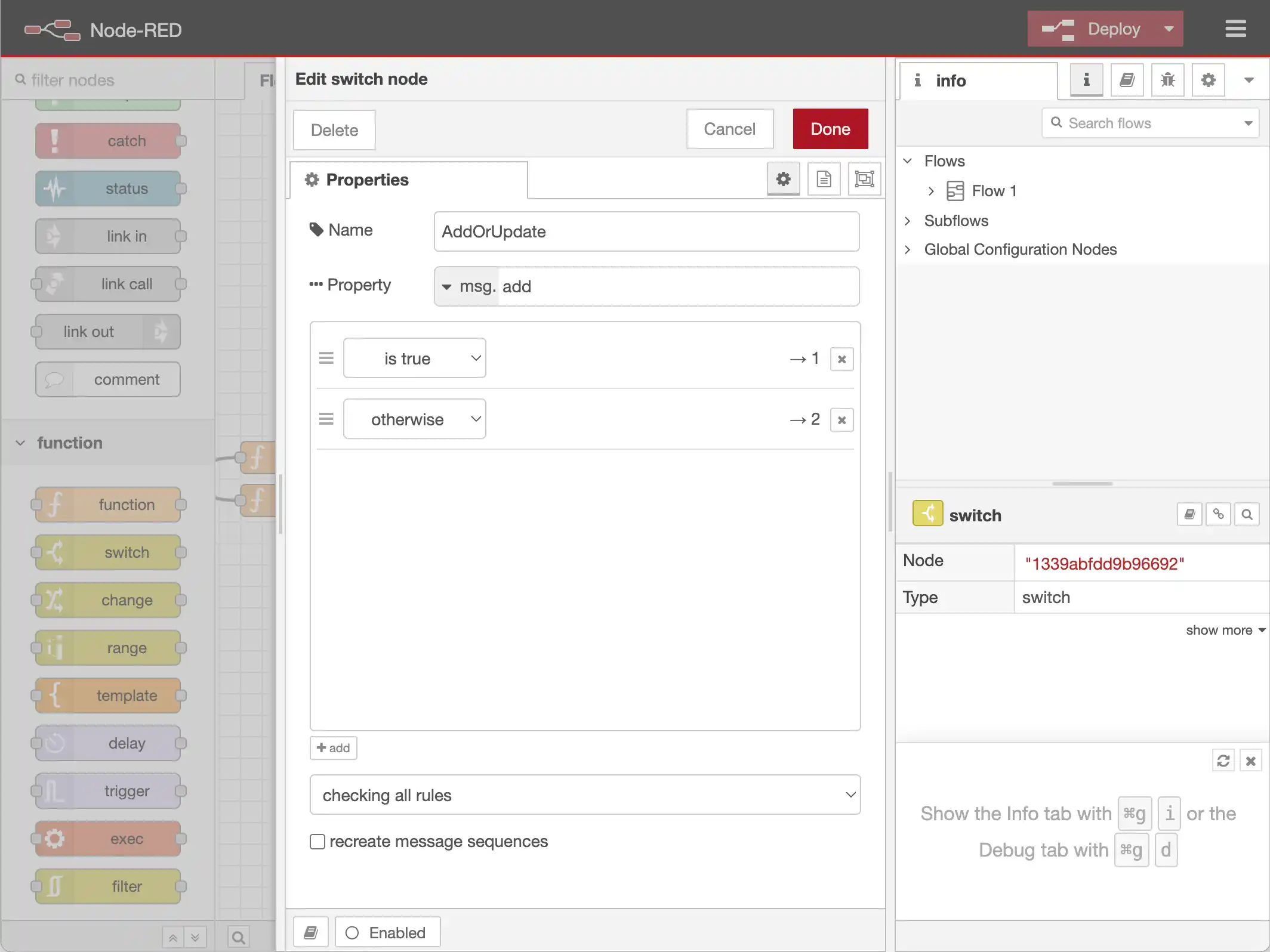 追加または更新を決定するには、msg.add に基づいて switch ノードを設定します: