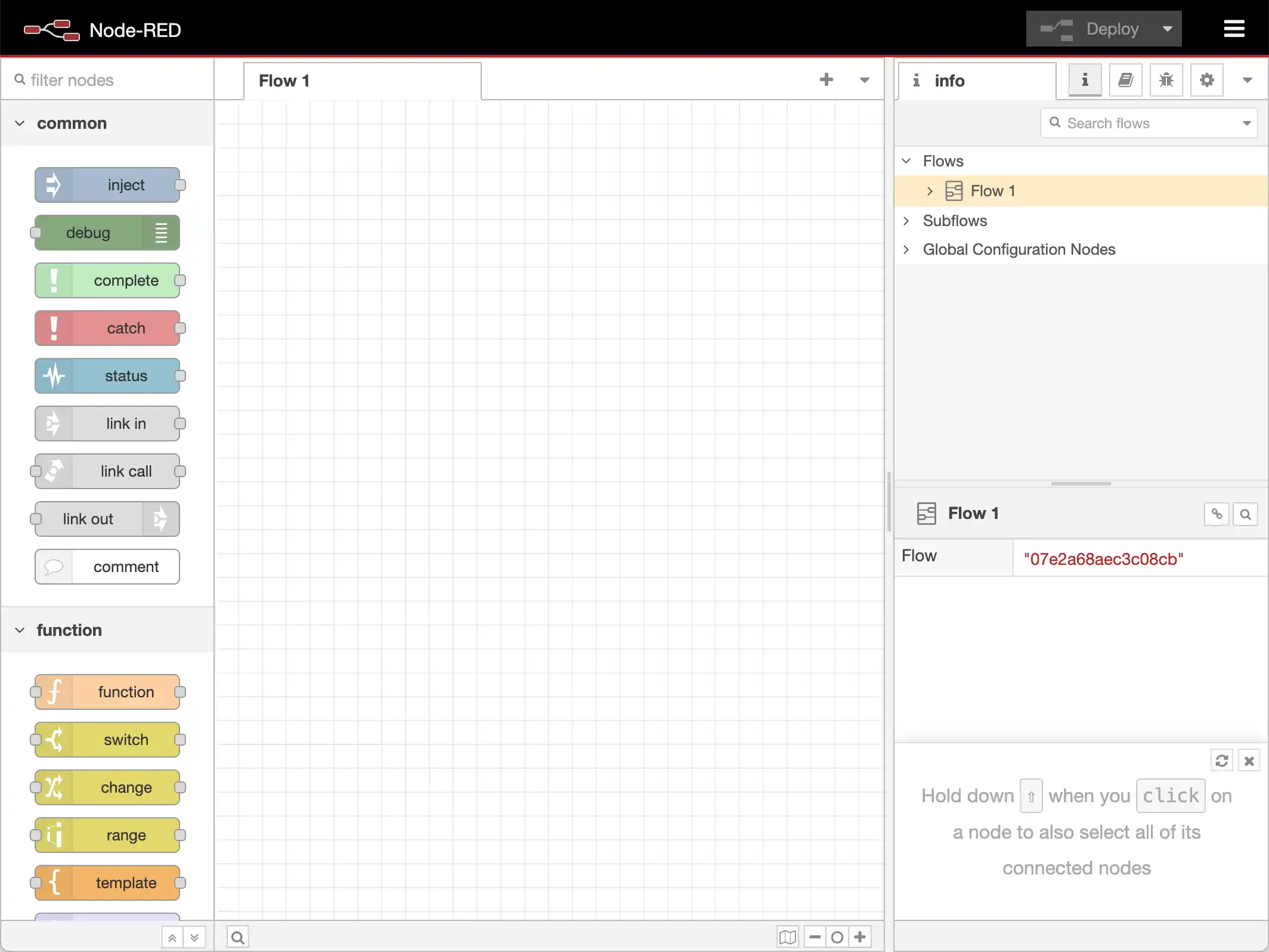 API Server からのデータに接続して使用する Node-RED フローの構築は、Node-RED インターフェースでコンポーネントをドラッグ&ドロップするだけの簡単な作業です。Node-RED を起動するには、コマンドラインから node-red を呼び出すだけです。初めてフローを作成する場合は、空のワークスペースが表示されます。