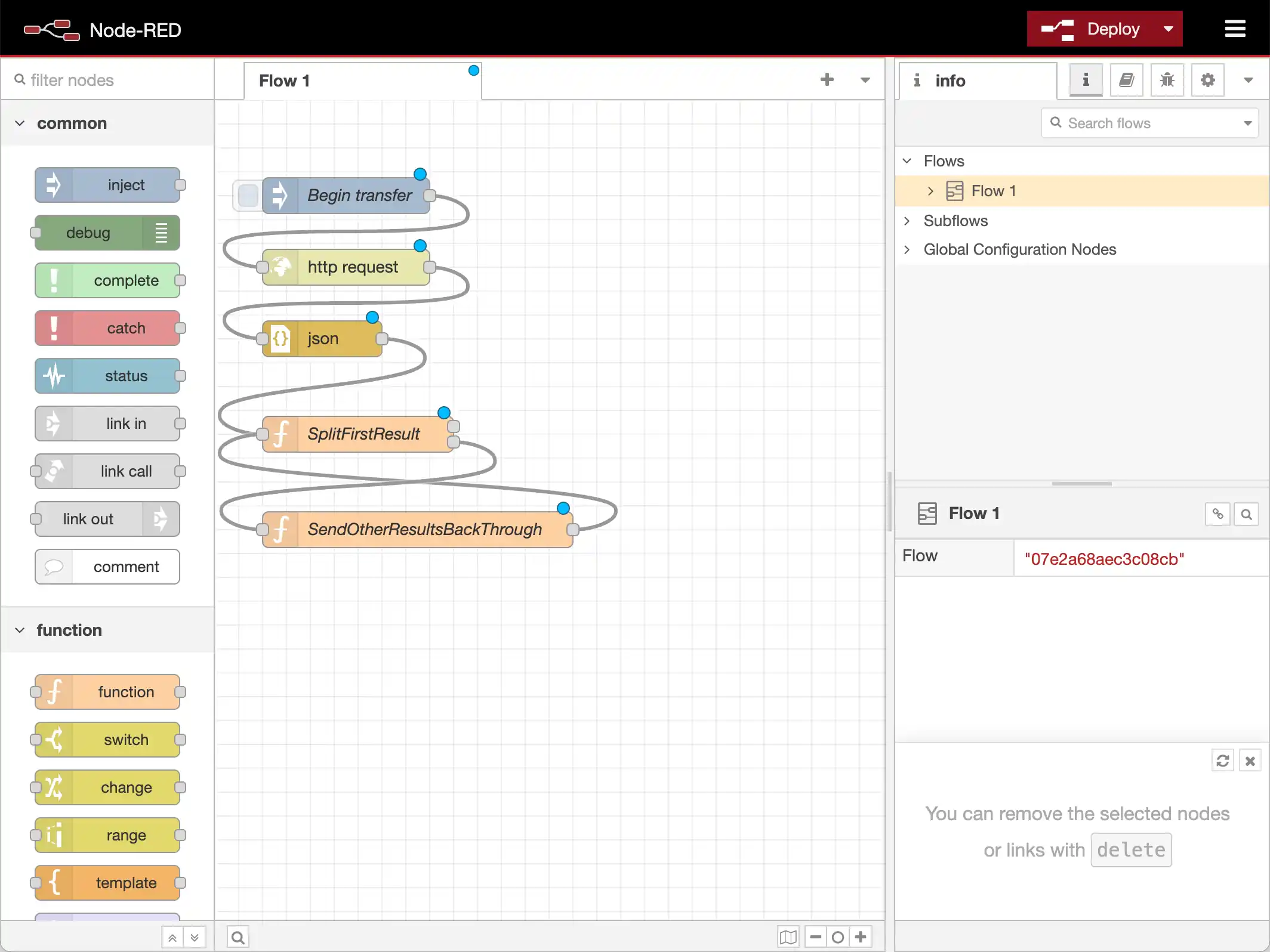 json ノードの出力から最初の新しい function ノード(SplitFirstResult)の入力へ、SplitFirstResult の2番目の出力から2番目の新しい function ノード(SendOtherResultsBackThrough)の入力へ、SendOtherResultsBackThrough の出力から SplitFirstResult の入力へ、それぞれワイヤを作成します。