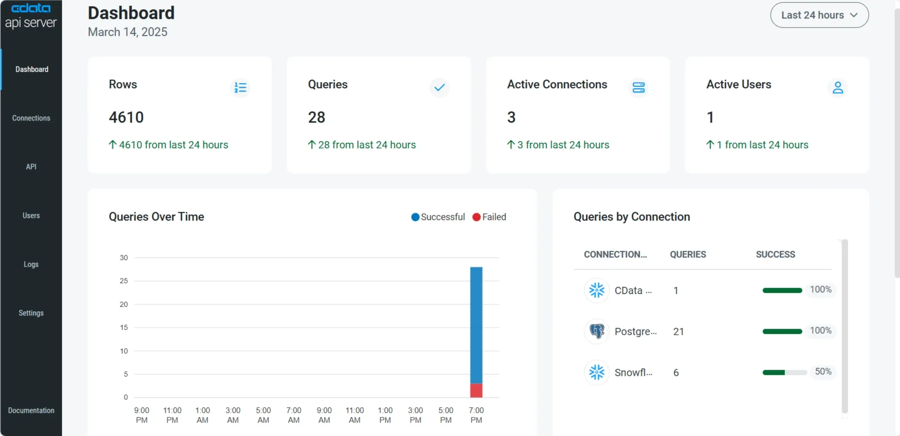 シンプルなポイント&クリックのインターフェースを使用して、接続を設定し、主要な RDBMS、一般的なファイル形式(CSV、TSV、JSON など)、 オンプレミスソース(QuickBooks、MS Excel、MS Access など)、NoSQL データベース、SaaS アプリケーション用の REST API を構築できます。 API Server はサーバー上に直接インストールされるため、API へのローカルアクセスとリモートアクセスの両方を簡単に提供できます。