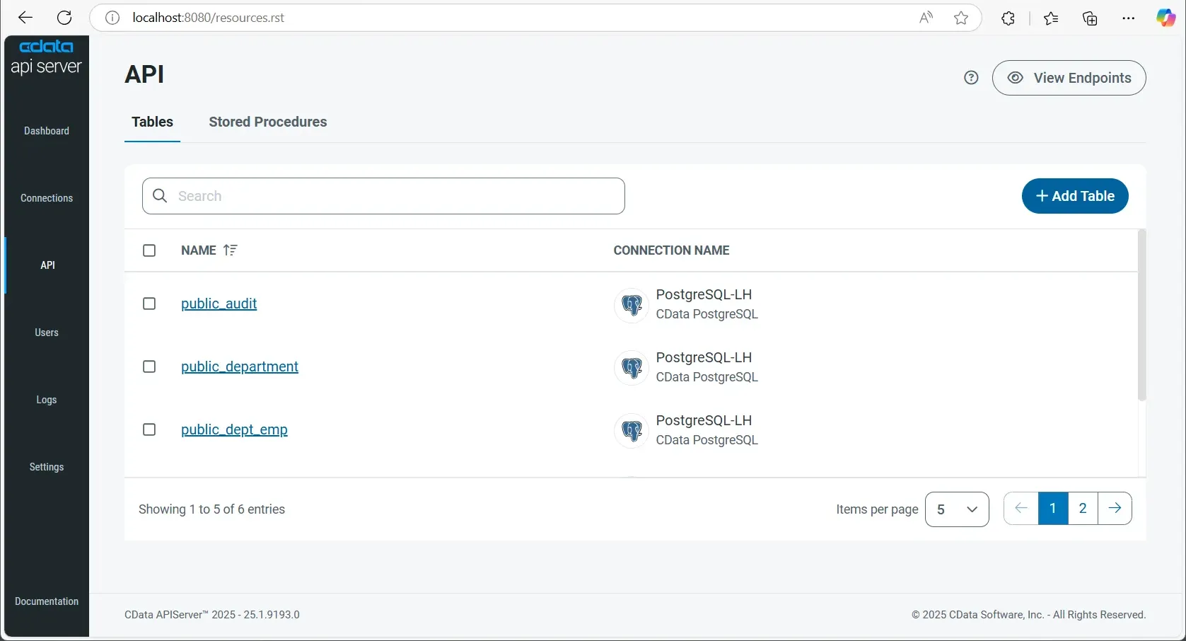 API Server の API ページには、さまざまなデータソースからのテーブルとして表現されるリソースと、 それらのソースで実行されるストアドプロシージャが含まれています。 OData エンドポイント URL または OpenAPI エンドポイント URL のいずれかを使用できます。 これらのベース URL は、テーブル名またはストアドプロシージャ名と組み合わせて、クエリアプリケーションで使用できます。