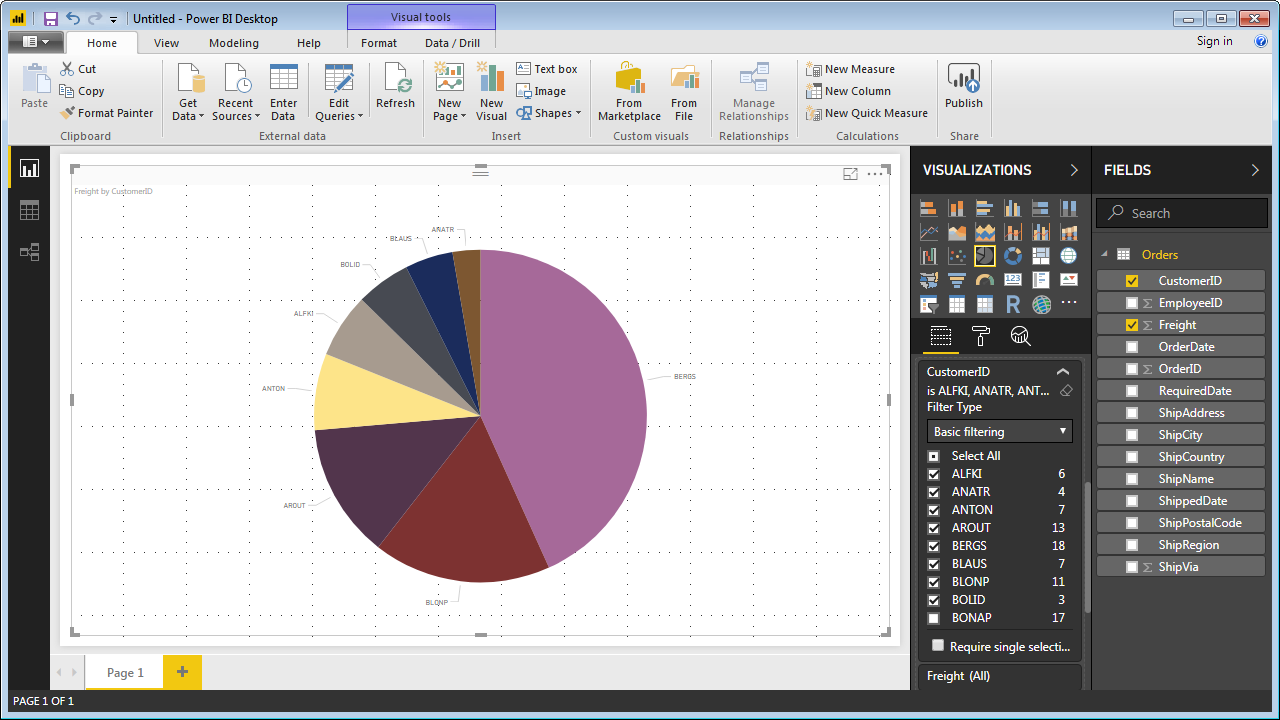 - [ビジュアライゼーション] ペインで円グラフアイコンを選択します。