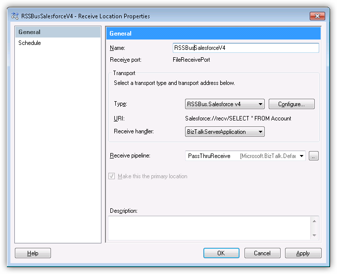 - Receive Location プロパティで、Transport Type メニューから CData.Salesforce を選択します。