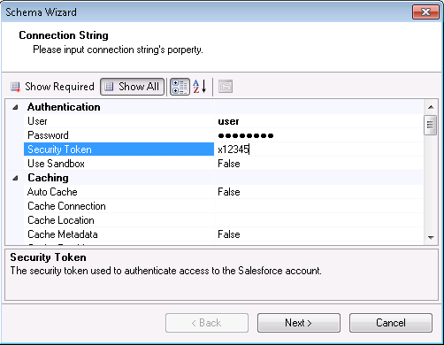 [Connection String Options] ダイアログで、Salesforce に接続するために必要な資格情報やその他のプロパティを構成します。