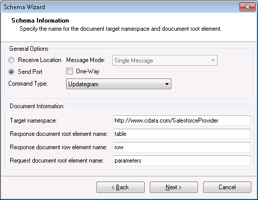 アップデートグラムは、Salesforce から必要なレスポンスを定義する構造になっています。アップデートグラムの例と詳細については、CData BizTalk Adapter for Salesforce でアップデートグラムを生成する方法を参照してください。