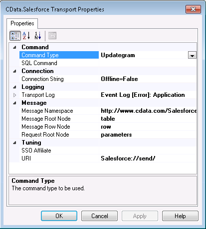 - [Transport Type] メニューで、[CData.Salesforce] を選択します。