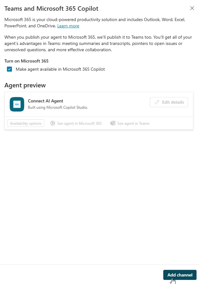 Channels タブに移動し、Teams and Microsoft 365 Copilot を選択して Add channel をクリックします。