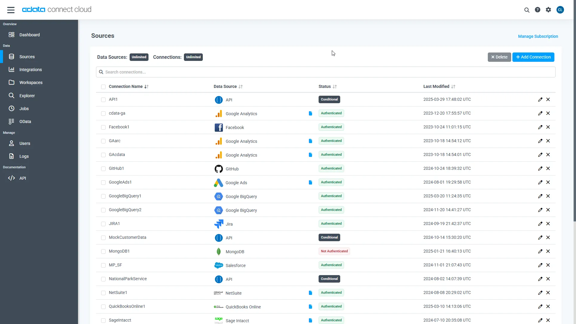 CData Connect AI は、アプリケーションを幅広いリアルタイムデータソースに接続する統合接続プラットフォームです。一貫性のある標準準拠のインターフェースを通じて、あらゆるシステム、あらゆる場所からシームレスにデータにアクセスするためのツールを提供します。 CData Connect AI の主な機能には、幅広いデータ接続性、リアルタイムデータアクセス、CRUD サポート、セキュアなアクセス、包括的なデータモデリングと動的ディスカバリーがあります。