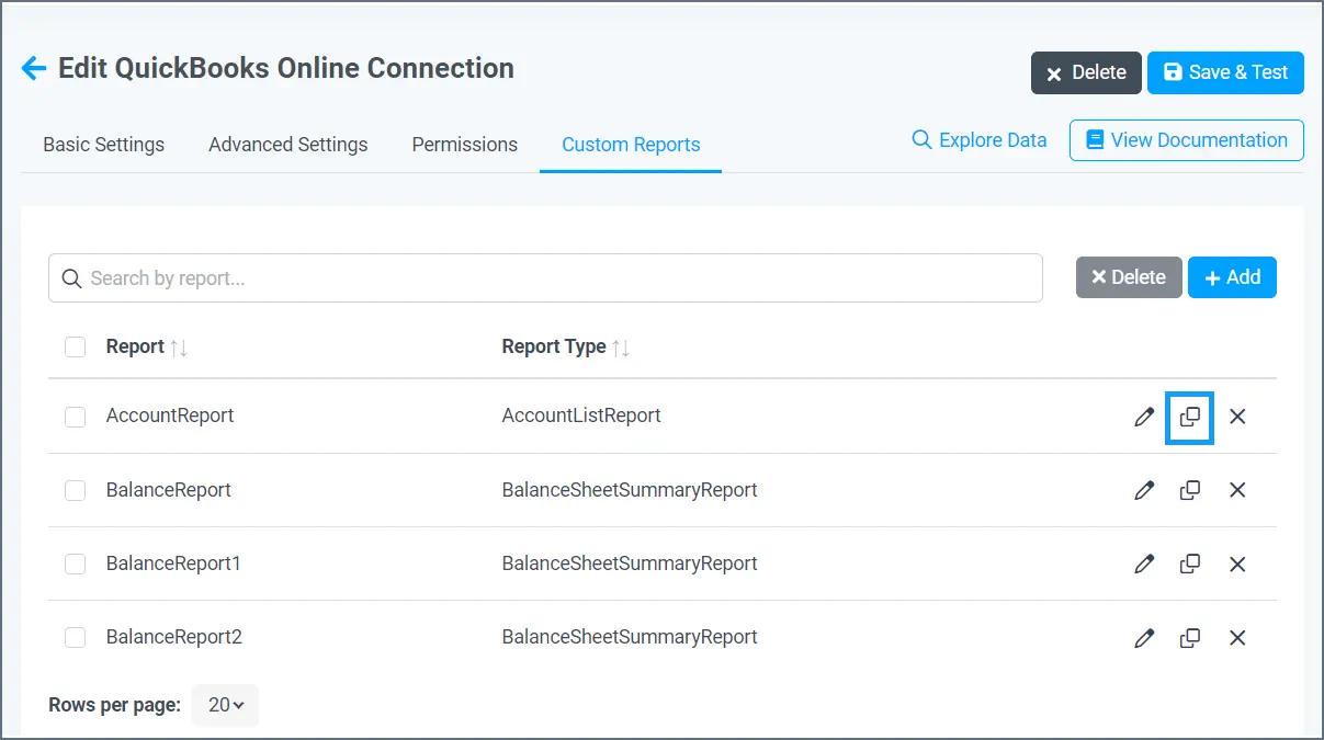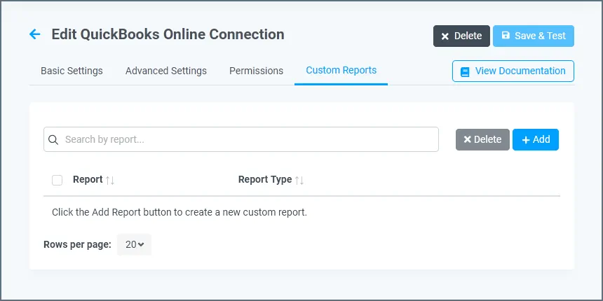 Custom Reports タブをクリックし、+Add ボタンをクリックして新しいレポートを追加します。
