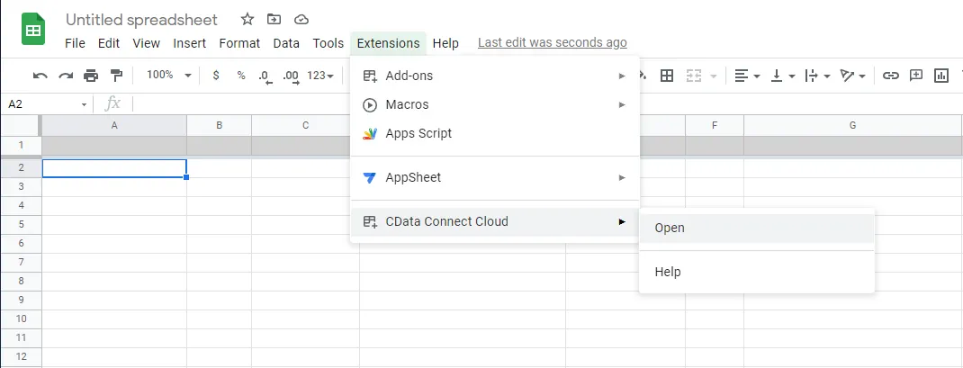 Connect AI パイプラインを通じてデータにアクセスするための最後の手順は、使用する連携先によって異なります。この例では、Google Sheets で Connect AI 拡張機能を確認できます。