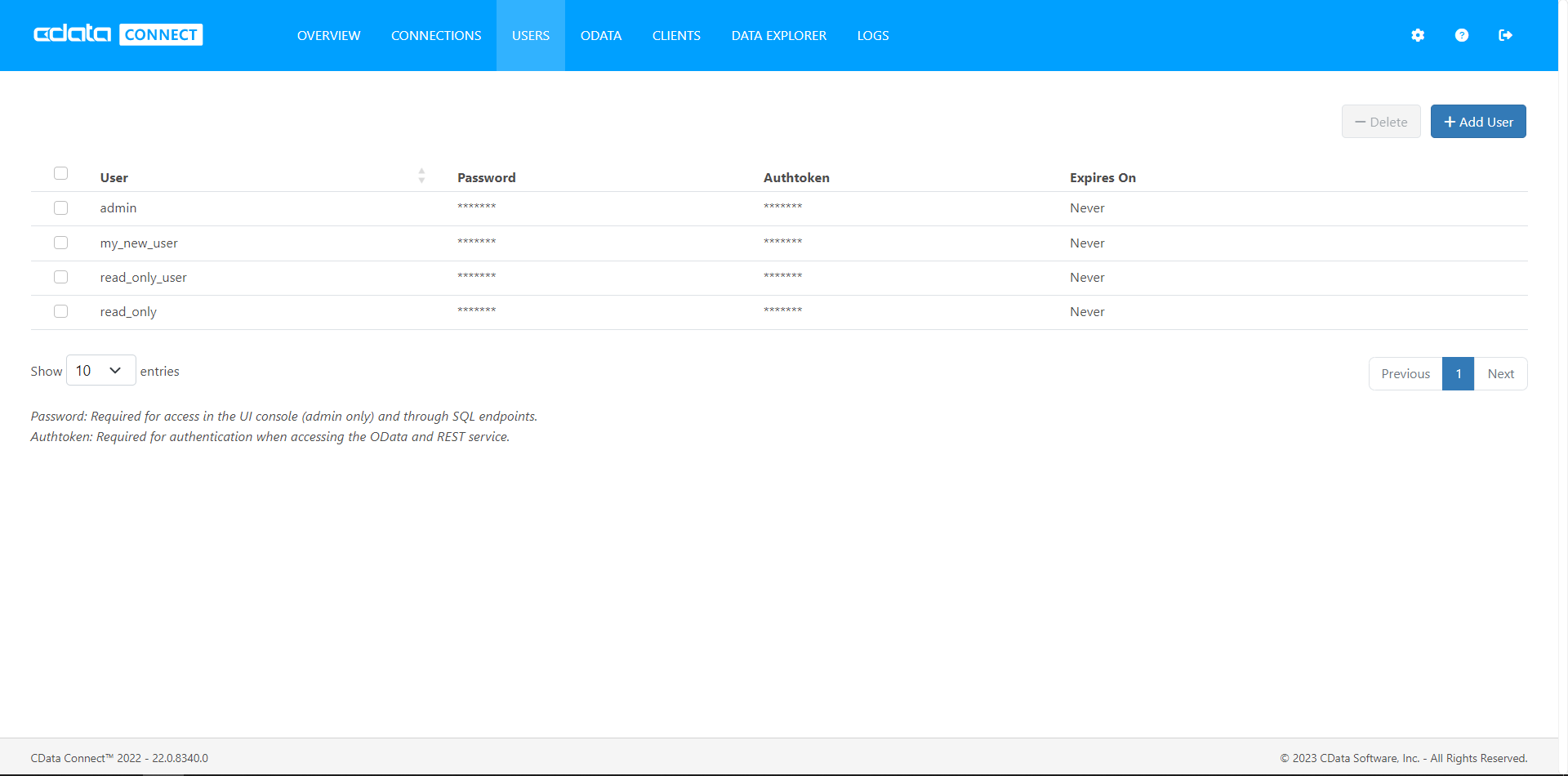 次に、Connect Server を通じてデータベースデータにアクセスするためのユーザーを作成します。Users タブでユーザーを追加および構成できます。 このデータ表示用のシンプルな React アプリでは、読み取り専用アクセス権を持つユーザーを作成します: Add User をクリックし、ユーザー名とパスワードを設定し、後で使用するために Authtoken を保存して、 Save Changes をクリックします。