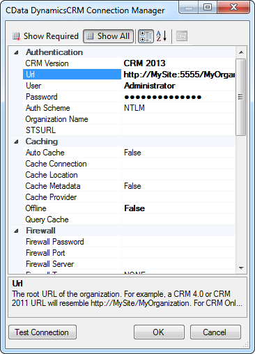 Dynamics CRM インスタンスが IFD 構成の場合は、STSURL プロパティを設定する必要があります。Dynamics CRM の接続マネージャーの作成方法については、コンポーネントのヘルプを参照してください。