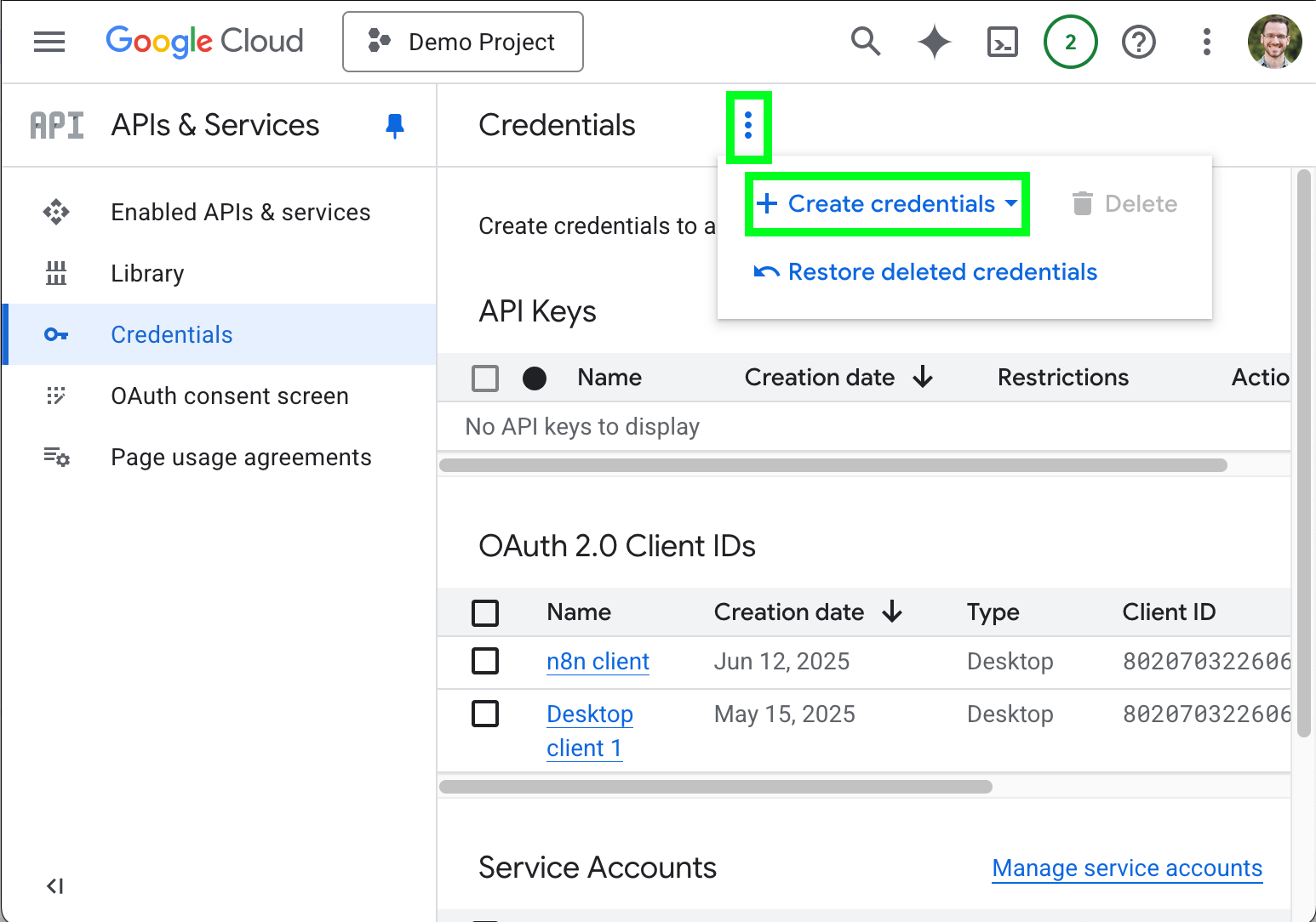 - オプションメニュー( )を開き、 認証情報を作成 を選択します。