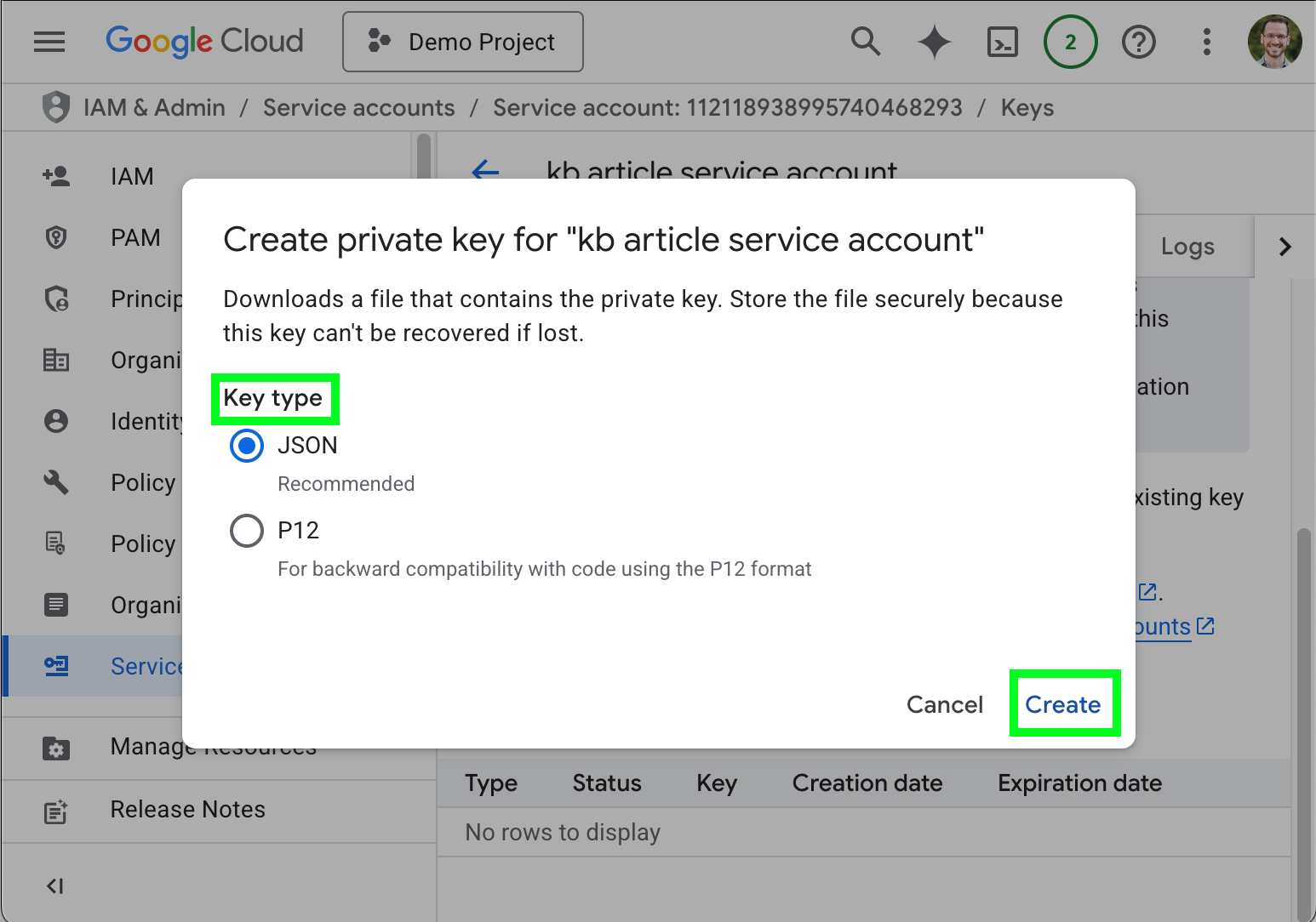 - サポートされている鍵の種類を選択し(この記事では JSON を使用します)、作成 をクリックします。