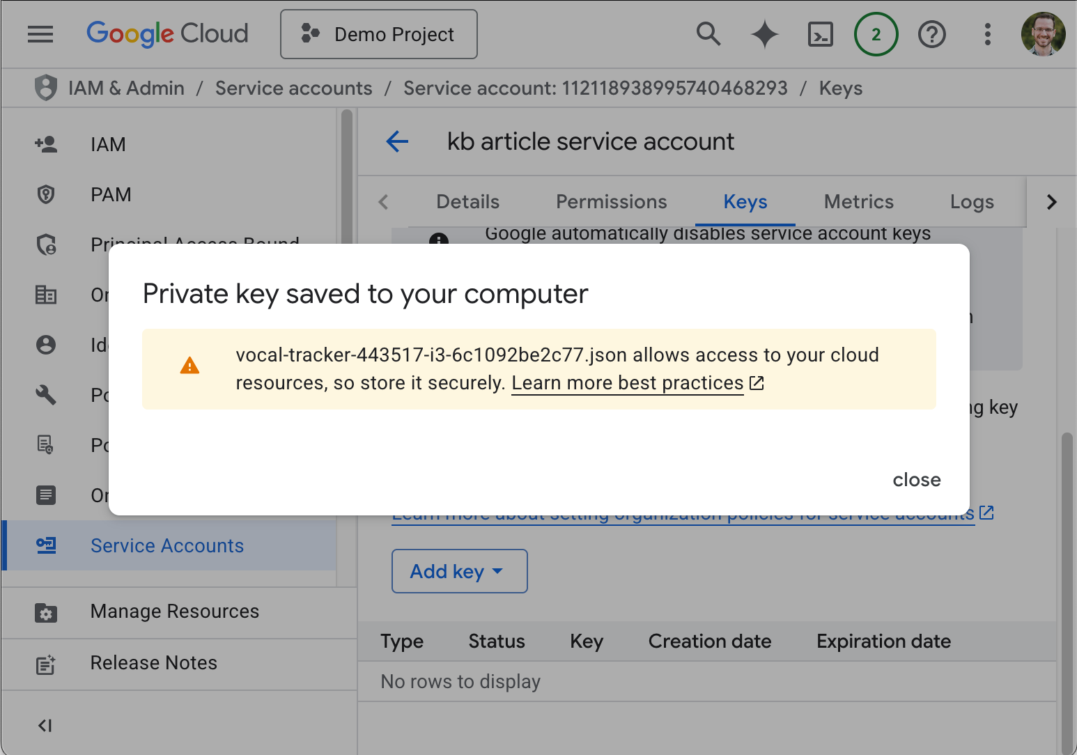 - Cloud Console の 認証情報 ページに戻り、サービスアカウント セクションまでスクロールして、作成したサービスアカウントを選択します。