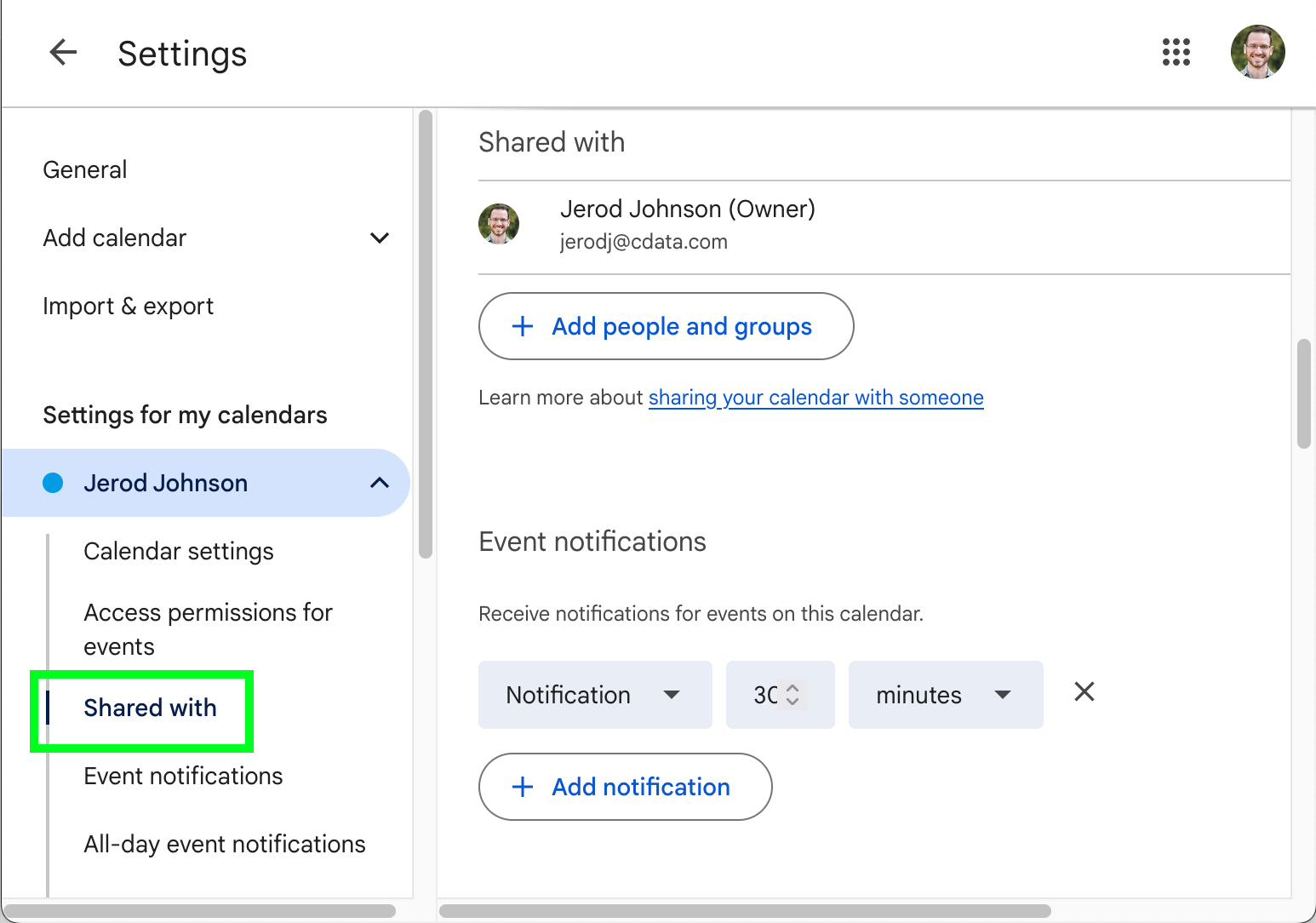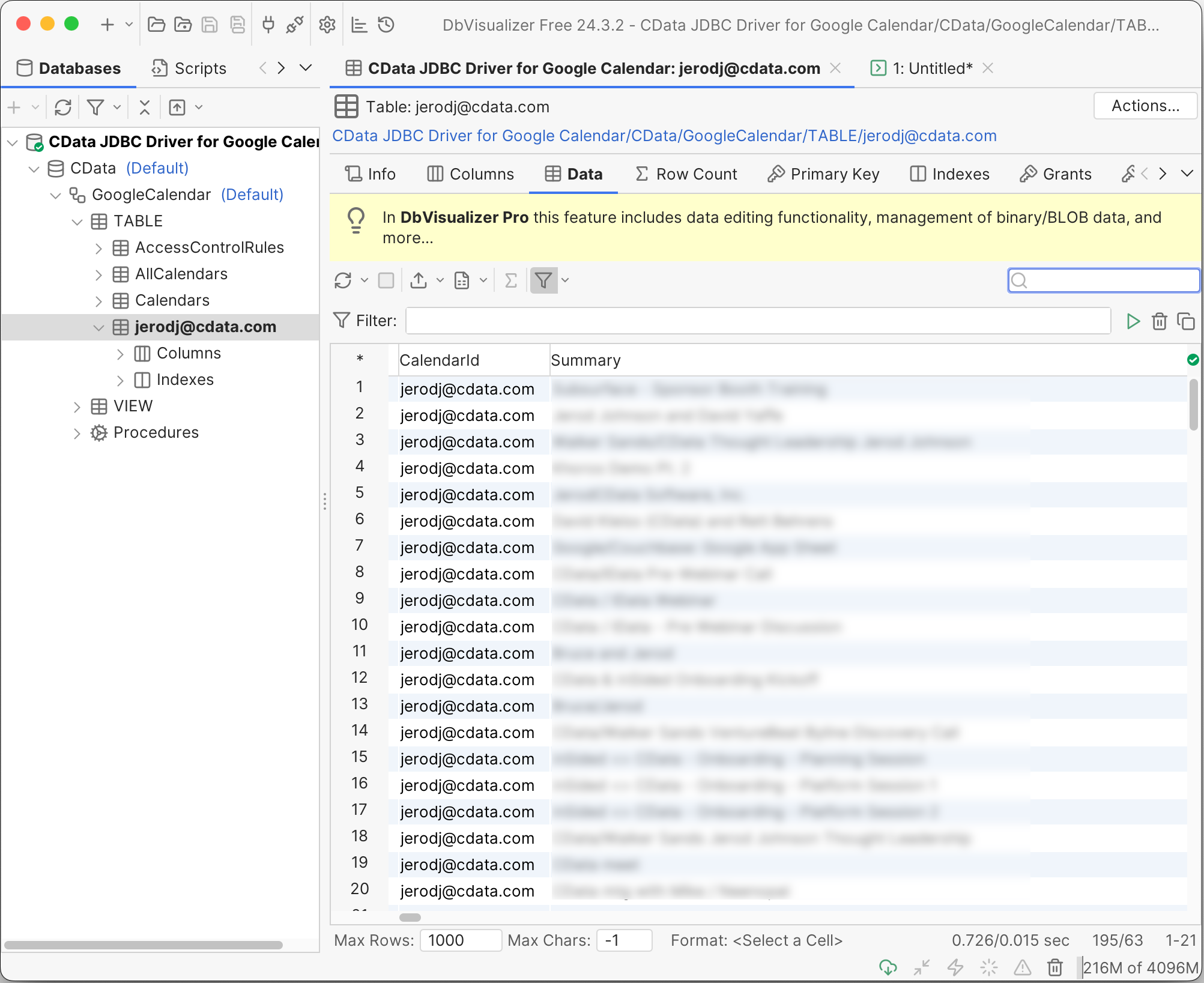 INSERT INTO "CData"."GoogleCalendar"."Calendars" (id) VALUES ("user@domain.com") - これで、JDBC 接続経由でカレンダーが利用可能になります: