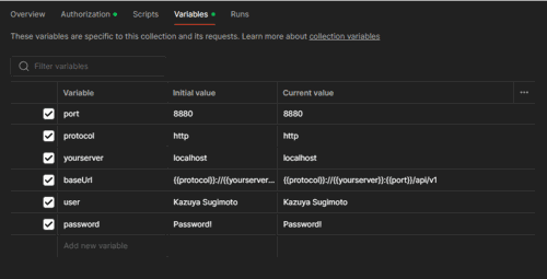 Postman Collection が設定できたら、Variables セクションで接続情報とログイン情報を設定しましょう。これにより、後続の各 API リクエストで簡単に再利用できるようになります。