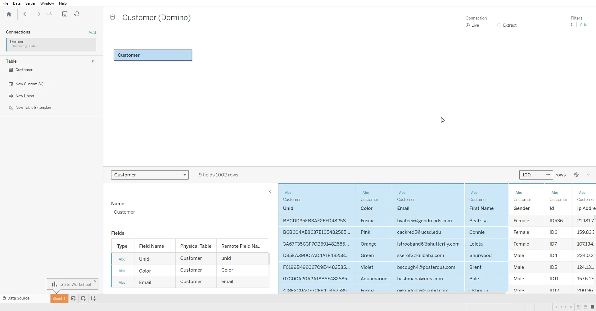 対象のテーブルを選択し、データプレビューを実行して Domino データを正常にロードします。