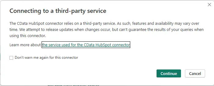 - Data Connectivity mode: Import / DirectQuery から選択します。Import モード(デフォルト)はデータを Power BI Desktop にインポートし、DirectQuery モードは更新のたびに HubSpot にライブクエリを実行します。