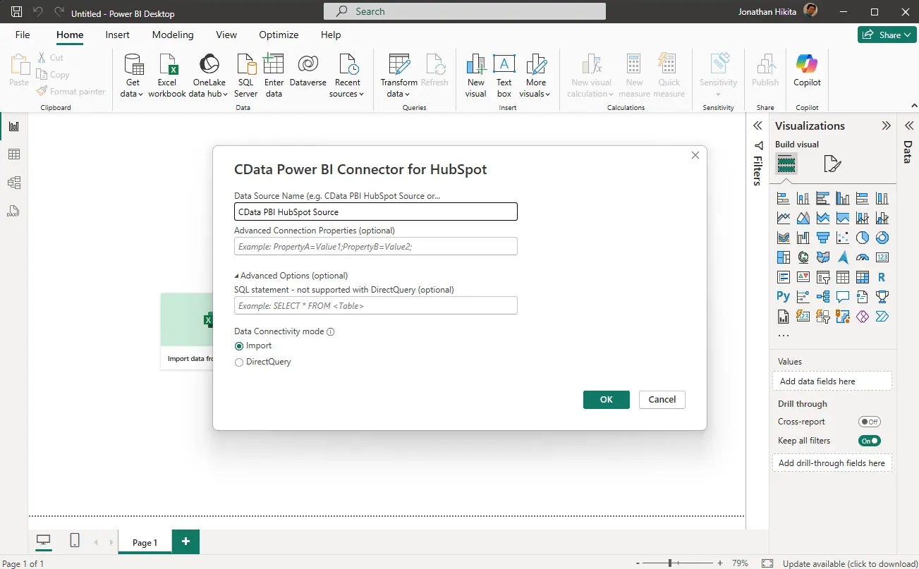 - Data Source Name: CData PBI HubSpot Source(または DSN 設定時に指定した名前)