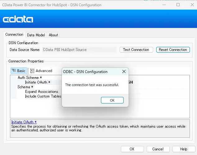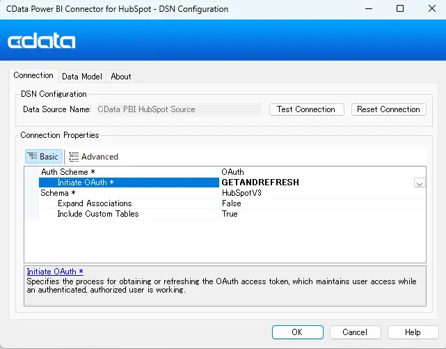 - インストール完了後、DSN(Data Source Name)設定ウィンドウが開きます。以下は CData Power BI Connector for HubSpot から HubSpot に接続するための基本設定です。カスタマイズについてはヘルプドキュメントを参照してください。