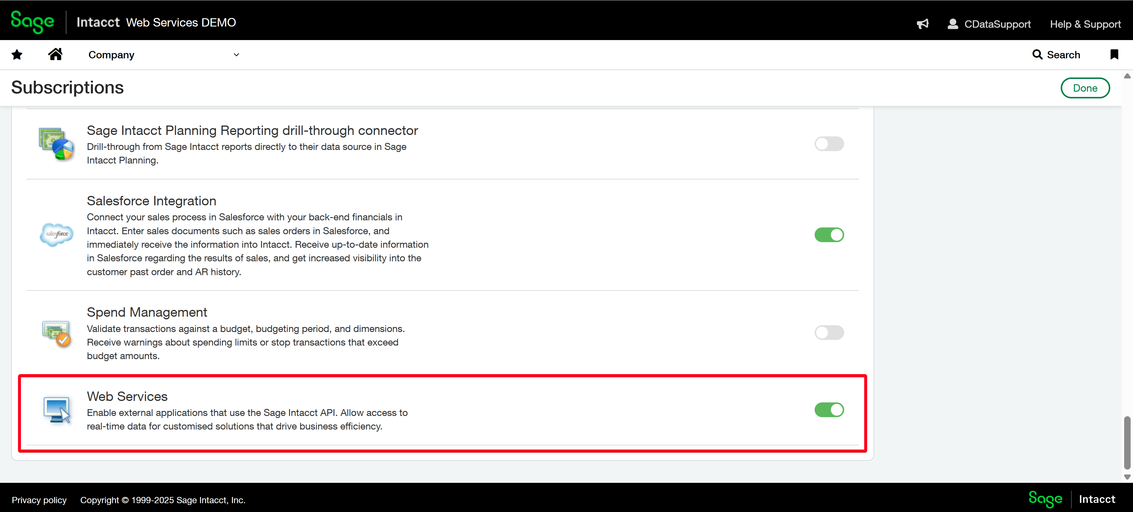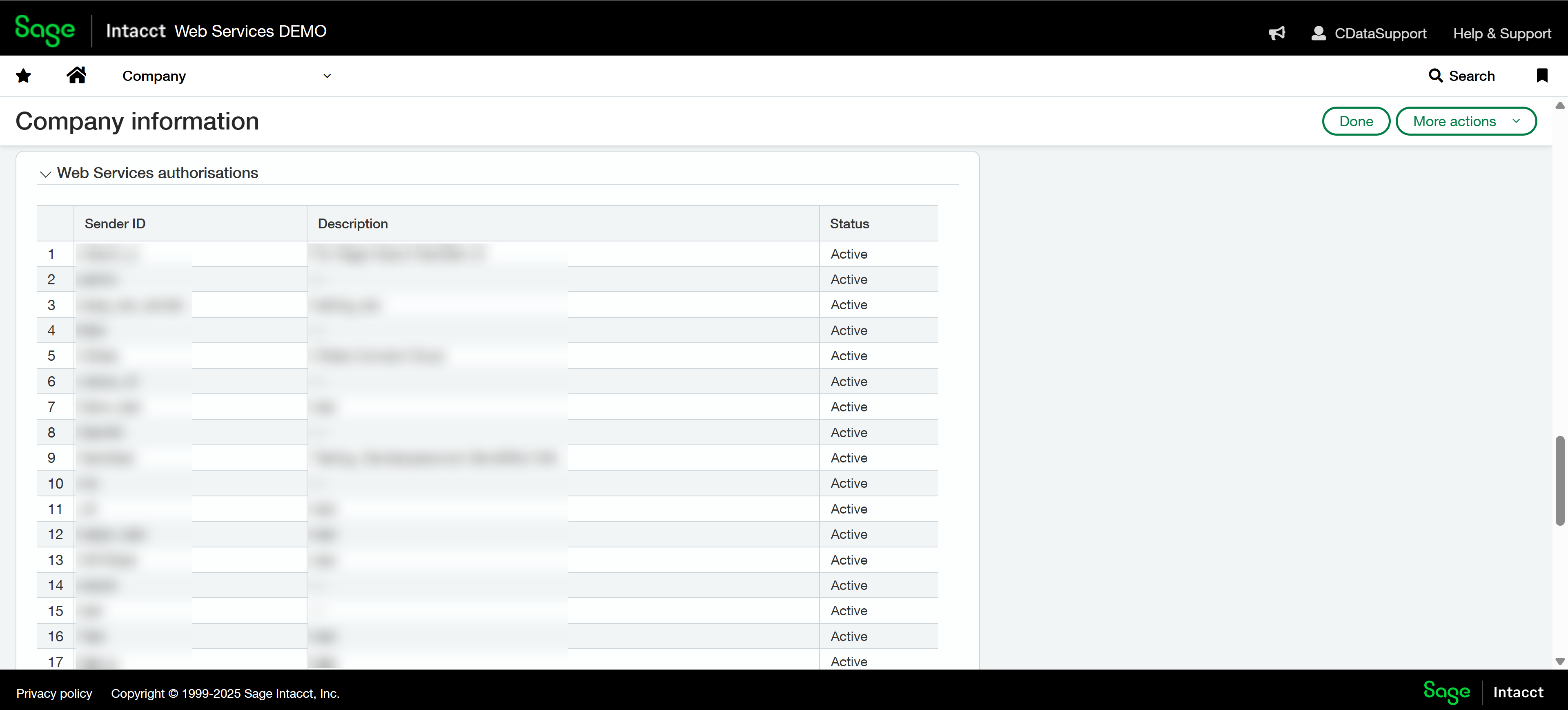Sage Intacct API にアクセスする CData Sync、CData Connect AI、CData Embedded のお客様は、お客様自身の Web サービス Sender ID とパスワードを使用する必要があります。