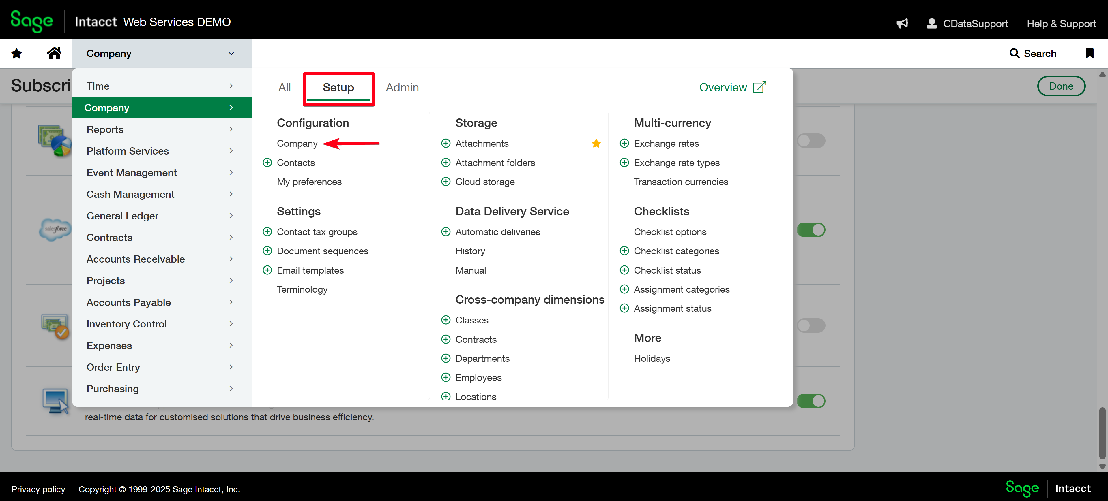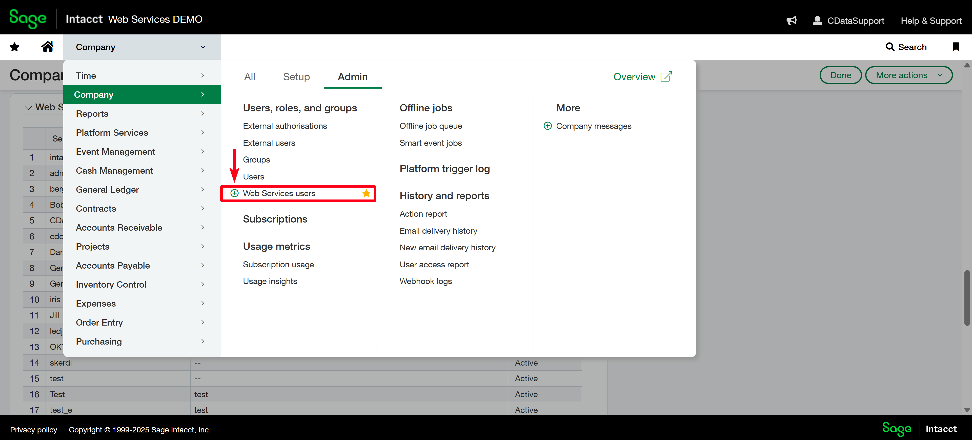 - Sage Intacct で Company > Admin > Web Services users に移動します。