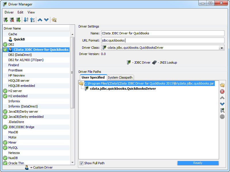 - User Specified タブで、Open File ボタンをクリックし、インストールディレクトリの lib サブフォルダにある cdata.jdbc.quickbooks.jar ファイルを選択します。