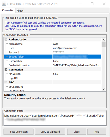 接続プロパティ(user、password、security token など)を入力したら、「Test Connection」をクリックします。