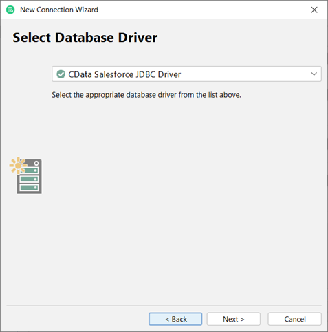 次の画面で、先ほど設定した新しいCData JDBC Driver を選択します。