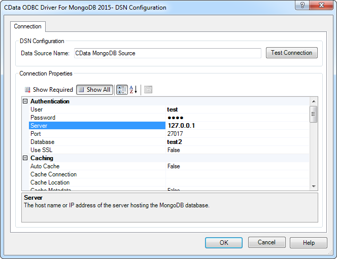 - Logfile 接続プロパティに、ドライバーが書き込み権限を持つ場所を設定します(例:C:\MongoDBLog.txt)。