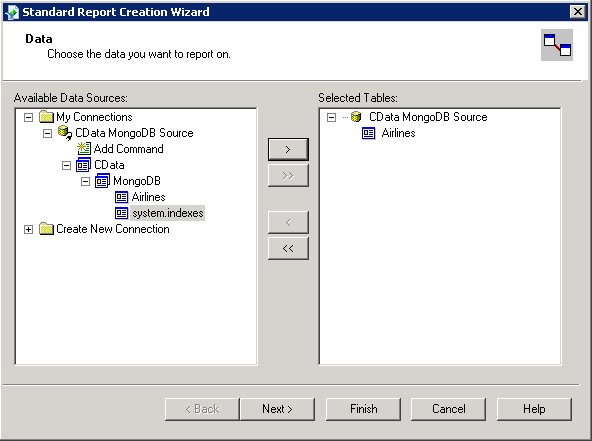 MongoDB への ODBC 接続を追加したら、レポートウィザードを使用して MongoDB オブジェクトをレポートに追加できます。