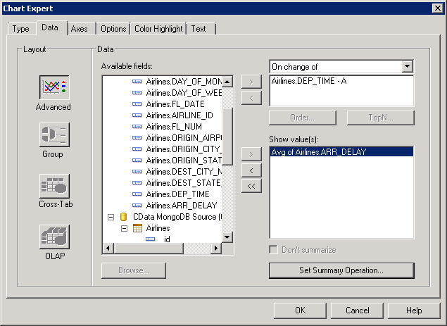 レポートウィザードで、Create New Connection -> ODBC をクリックし、MongoDB DSN を選択します。レポートに必要なテーブルとフィールドを選択して、データソースを構成します。ここでは、米国運輸統計局の 2015 年国内便のデータセットを使用します。 その後、チャートやその他のレポートオブジェクトを作成できます。レポートオブジェクトでは、レポートフィールドの集計やソートが可能です。
