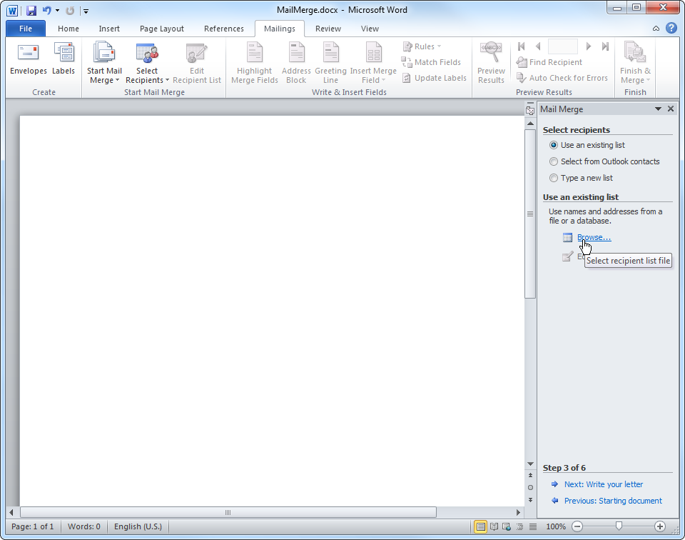 - 「次へ」をクリックし、テンプレートから開始するか、白紙の文書から開始するか、既存の文書から開始するかを選択します。この例では、白紙の文書から開始します。最後に「次へ」をクリックして、宛先を選択します。