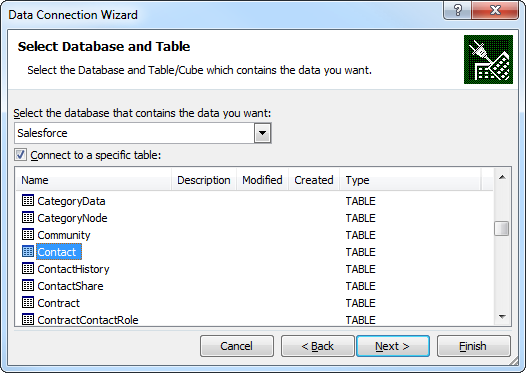 注意:ここに Salesforce のソースが表示されない場合は、CData Driver for Salesforce がインストールされ、DSN が設定されていることを確認してください。 - Contact テーブルを選択します。テーブルを選択したら、「次へ」をクリックし、データ接続ファイルを保存するための情報を入力します。完了したら「完了」をクリックします。