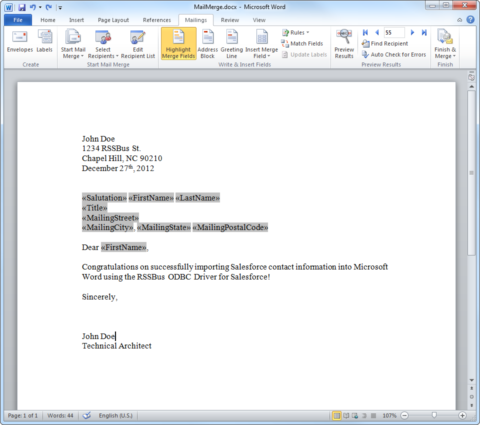 Microsoft Excel、PowerPivot、Word など、ODBC 経由でデータにアクセスできるアプリケーションであれば、CData ODBC ドライバーを活用してライブデータに接続できます。Microsoft Word の差し込み印刷を使用すると、連絡先情報を自動的に挿入できるテンプレートレターを作成でき、時間を大幅に節約できます。連絡先情報のソースとして ODBC データソースを使用できます。