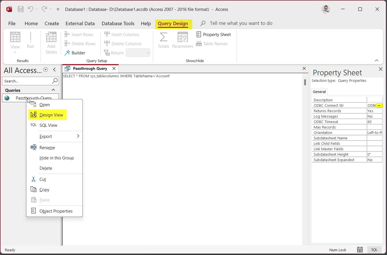 - 保存したクエリは、左側のすべての Access オブジェクトペインに表示されます。 クエリ(例:Passthrough-Query)を右クリックし、デザインビューを選択します。