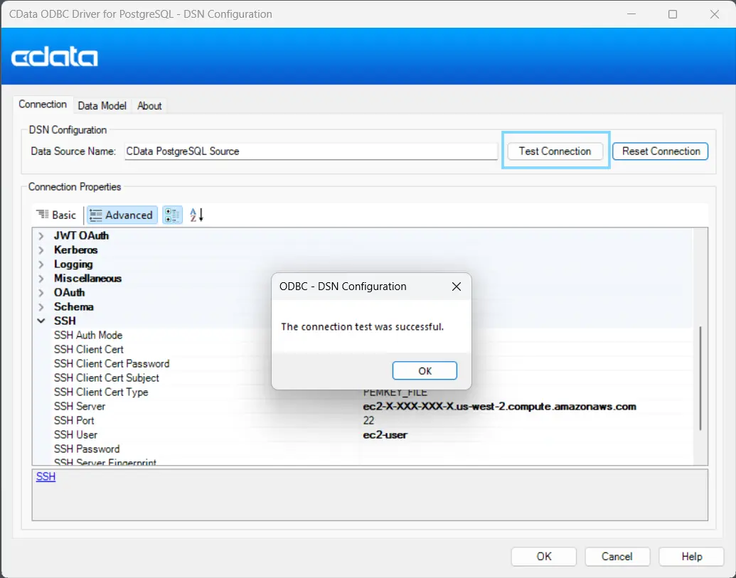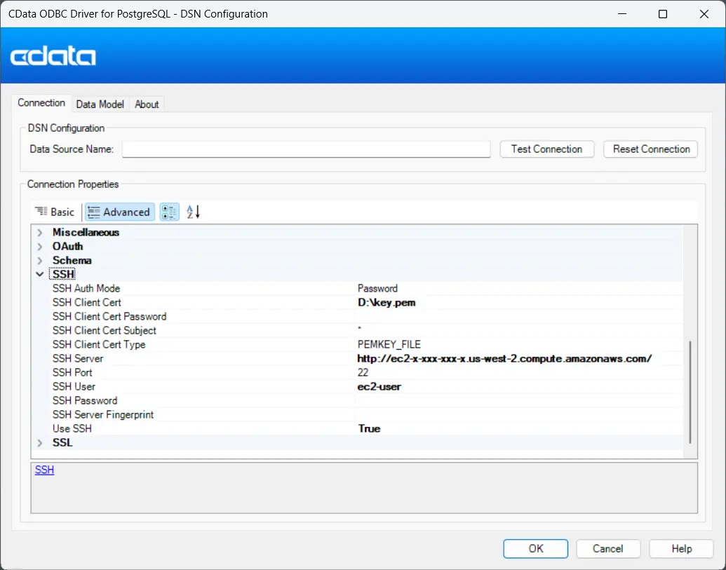 - 設定: CData ODBC Driver for PostgreSQL をインストールし、データベースと SSH の詳細情報を含む DSN を作成します。