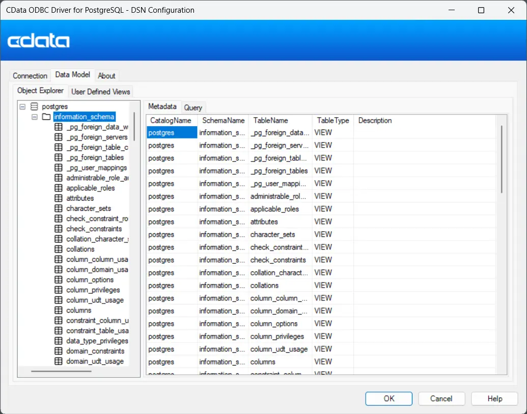 ドライバーの接続ダイアログで Data Model タブをクリックすると、PostgreSQL インスタンスで利用可能なスキーマ、 テーブル、カラムを確認できます。